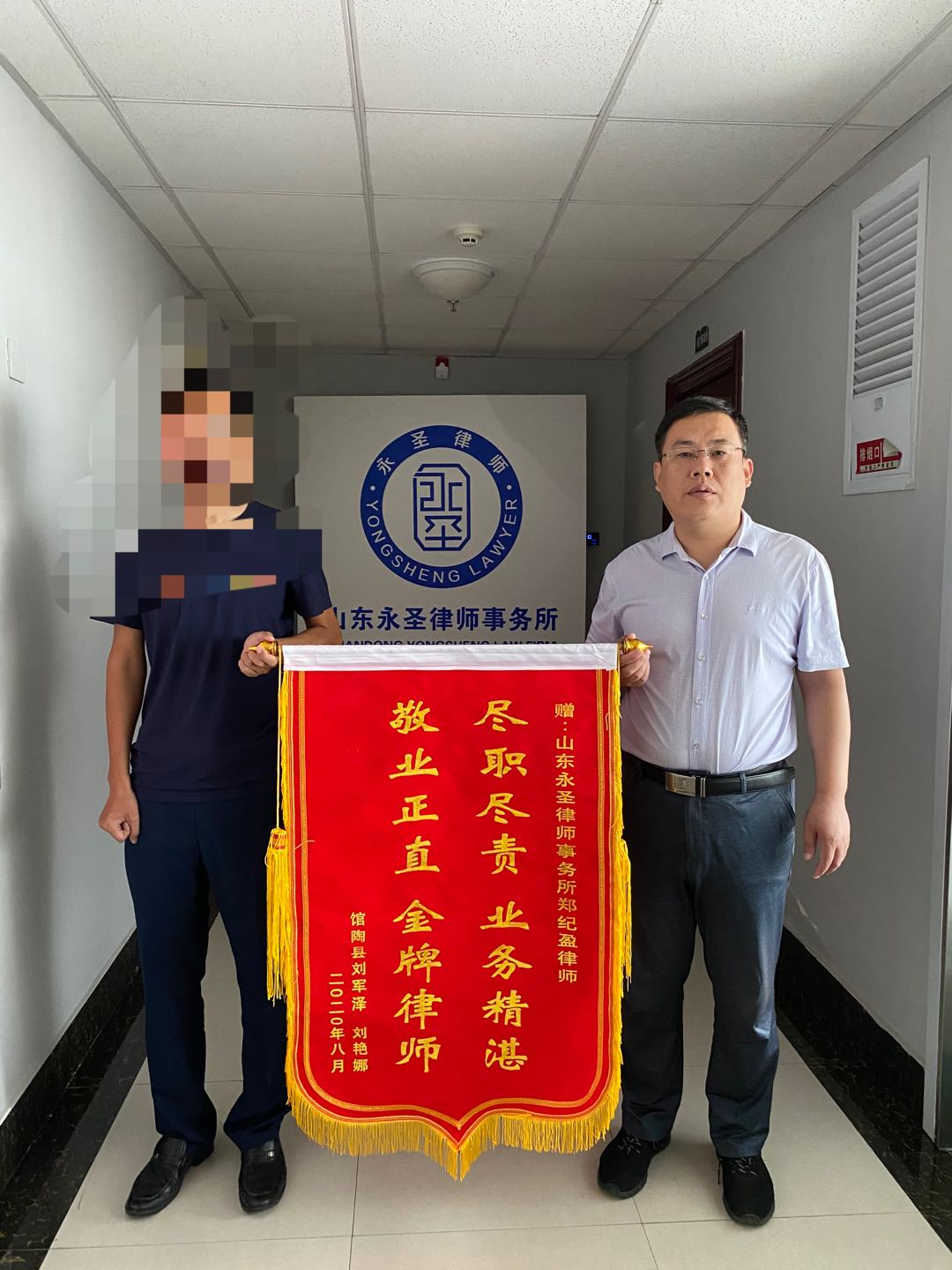 郑纪盈律师,收到案件当事人及家属送来的锦旗,赞赏郑纪盈律师法律业务水平的同时也表达内心感激之情。